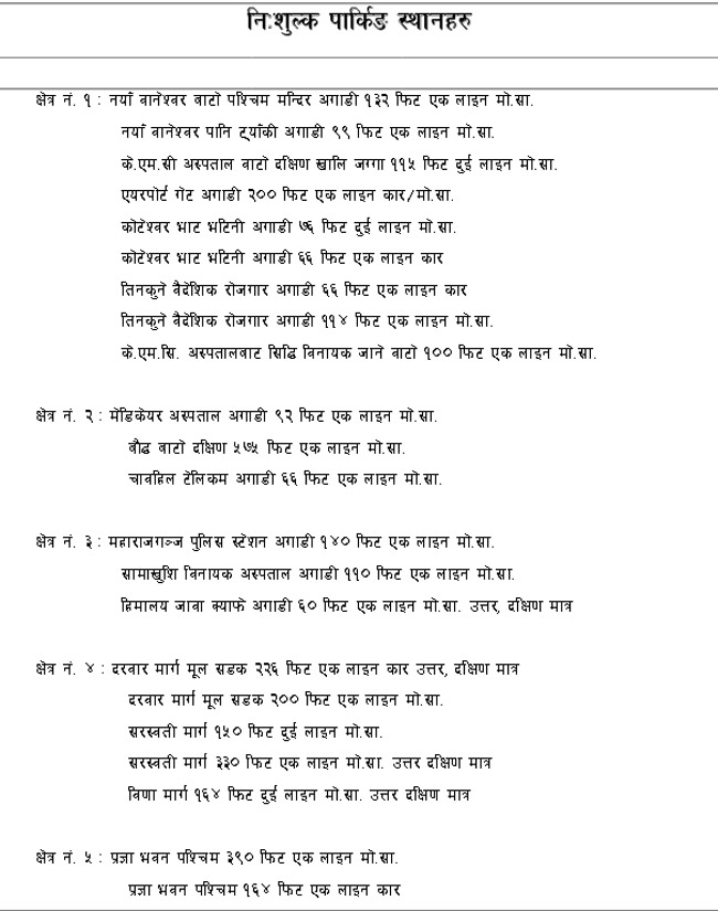 महानगरपालीकाले नयाँ बानेश्वर, प्युखा, खिचापोखरी, कालीमाटी लगायतका ७३ स्थानमा निःशुल्क पार्किङको व्यवस्था गर्न लागेको हो । यी स्थानहरुमा औपचारिक र अनौपचारिक रुपमा दुई पाँग्रो र चार पाँग्रे सवारी पार्किङ हुँदै आएका छन् । स्थानीय स्वयत्त शासन ऐन ०५५ र नियमावली ०५६ का प्रावधानअनुरुप महानगरपालीकाले पार्किङ शुल्क लिएर सवारी व्यवस्थापन गर्दै आएको थियो । उक्त व्यवस्था असार मसान्तमा सकिएपछि अब निःशुल्क पार्किङ बनाइएको महानगरको भनाई छ ।