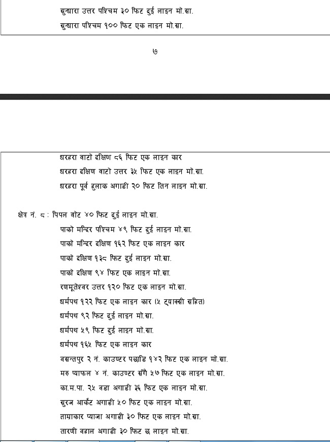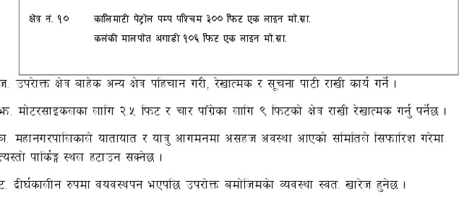 निःशुल्क पार्किङको व्यवस्था भएपनि चालक मर्यादामा भने रहनुपर्छ । पार्किङ स्थलको प्रारम्भ बिन्दु र अन्तिम बिन्दुमा रेखाचिन्ह र सूचना पाटी राखिने छ । रेखा चिन्हभन्दा बाहिर राखिएका सवारी साधनलाई १ हजार रुपैयाँ जरिवाना गरिने छ । मोटरसाइकलका लागि २.५ फिट र चारपांग्रेका लागि ९ फिटको क्षेत्र राखी रेखाङ्कन गरिने बताइएको छ ।