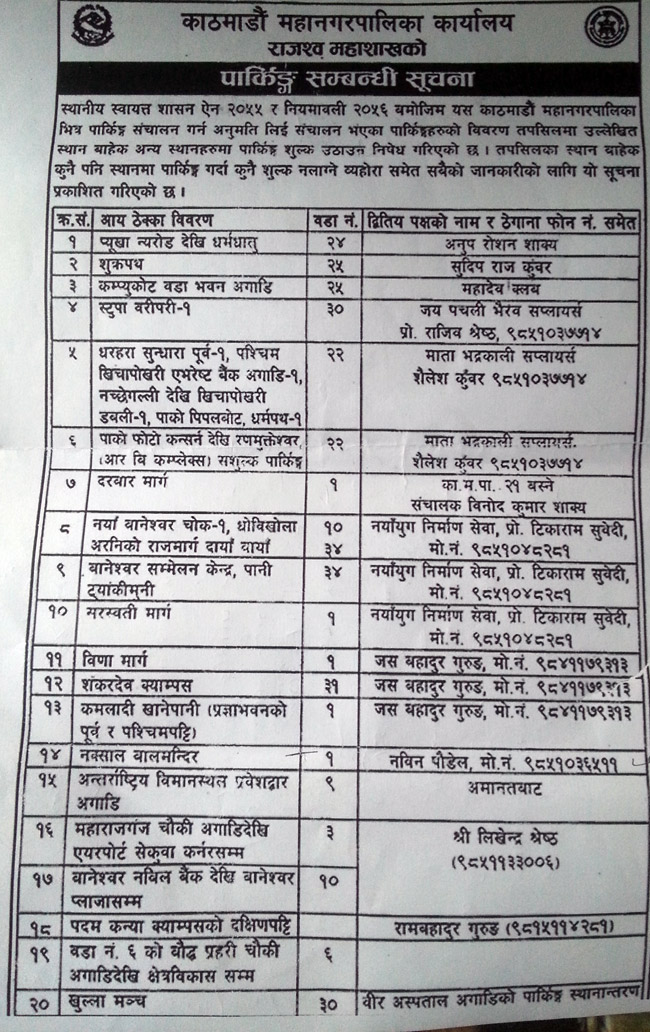 महानगरपालीकाले फागुन महिनामा काठमाडौंका ७३ स्थानमा खुला प्रतिस्पर्धाबाट पार्किङका लागि बोलपत्र आहृवान गरेकोमा पार्किङ ठेकेदारहरुले महानगरको कदम न्याससंगत नभएको भन्दै वैशाखमा सर्वोच्च र पुनरावेदन